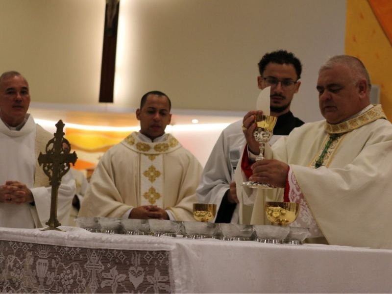 Durante a celebração, Dom Carvalho realizou o rito de aspersão da assembleia e deu posse ao primeiro administrador paroquial, o padre Matheus Augusto Silva Souza, ordenado sacerdote há dois anos. Ao confiar-lhe esta missão, o bispo destacou a importância do pastoreio próximo, do cuidado com as comunidades e do fortalecimento da ação evangelizadora.